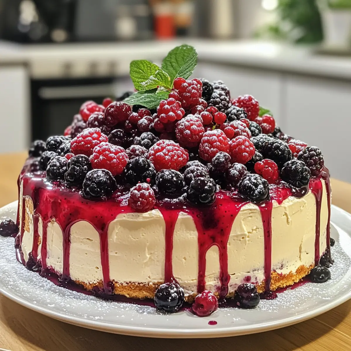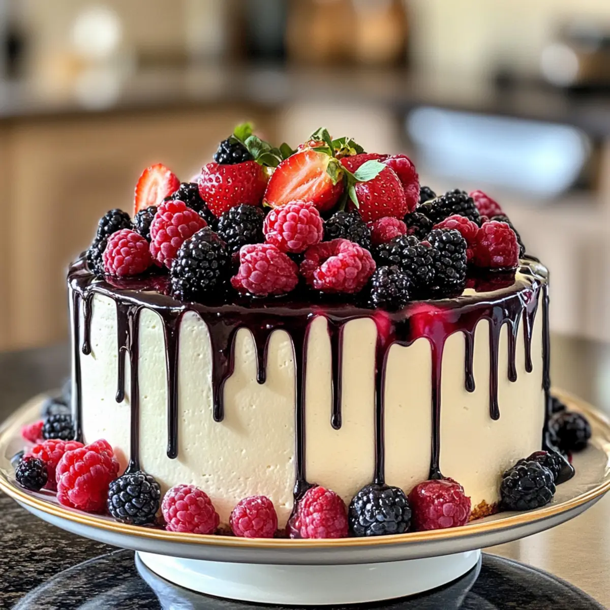 Showstopper Presentation: This cake boasts a stunning visual appeal with its colorful array of berries, perfect for brightening up any table.