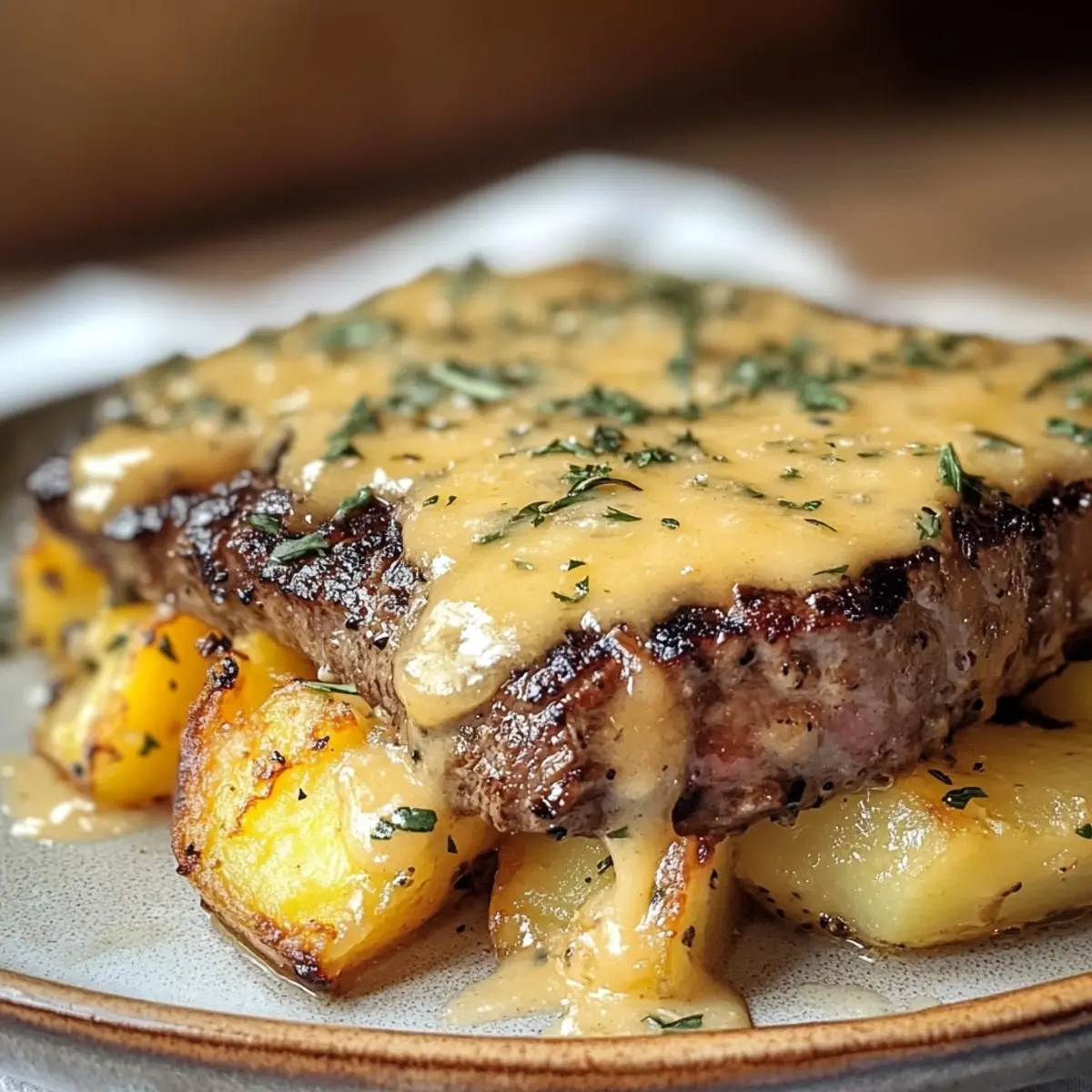 Indulge in Creamy Garlic Butter Steak & Cheddar Potato Bake