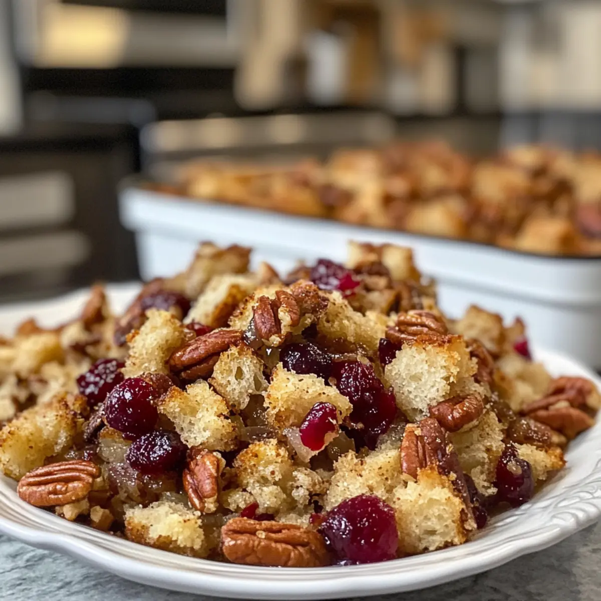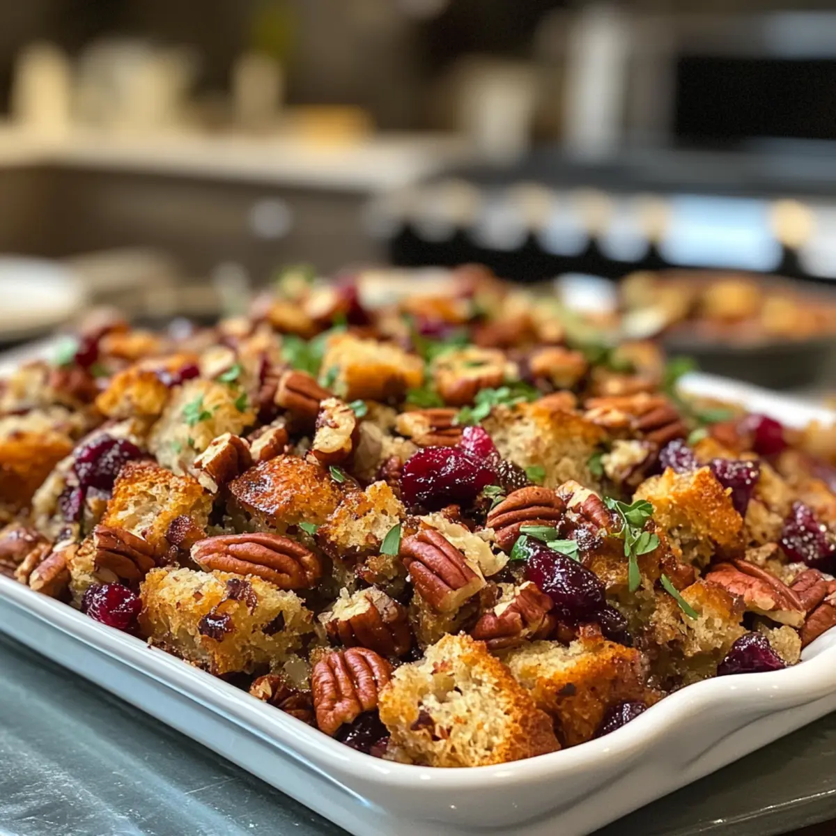 Comforting Flavors: This stuffing is a blend of savory herbs, sweet cranberries, and crunchy pecans, delivering that quintessential holiday taste.