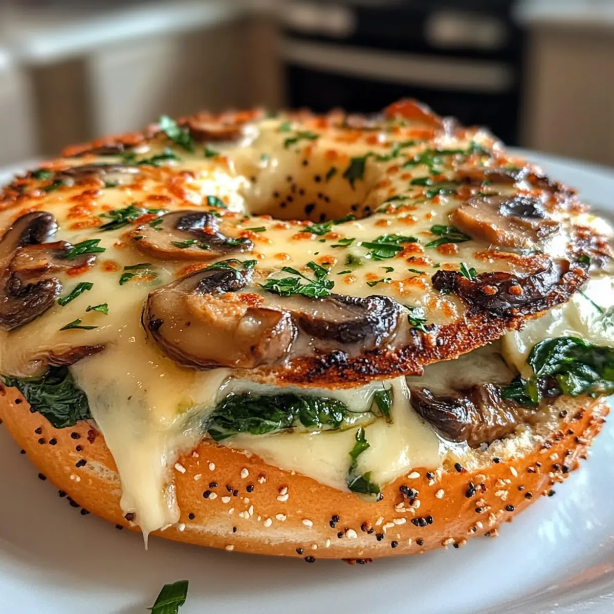 Slice the bagels in half and place them cut side up on the prepared baking sheet. Generously spoon the mushroom-spinach mixture onto each half, allowing the earthy flavors to shine through.