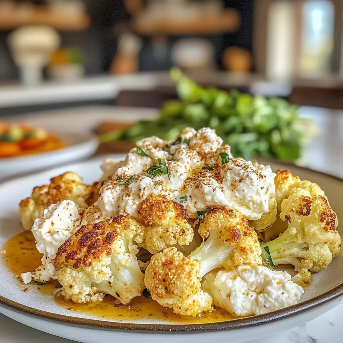 5. Assemble: Serve the warm roasted cauliflower on a platter, garnishing it generously with the creamy whipped feta.