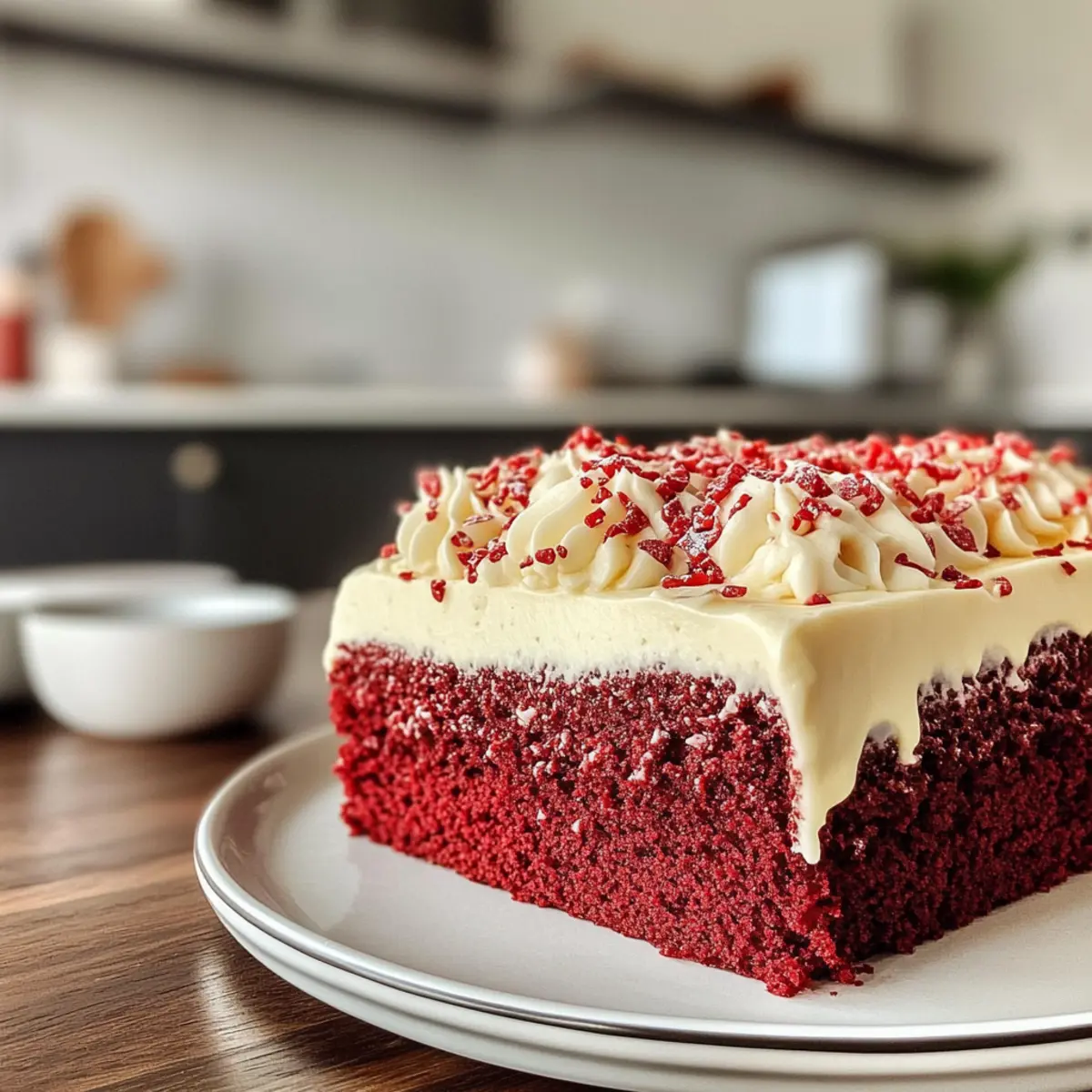 Embrace the enchanting world of desserts with this irresistible decadent red velvet sheet cake that promises to bring joy to your table!