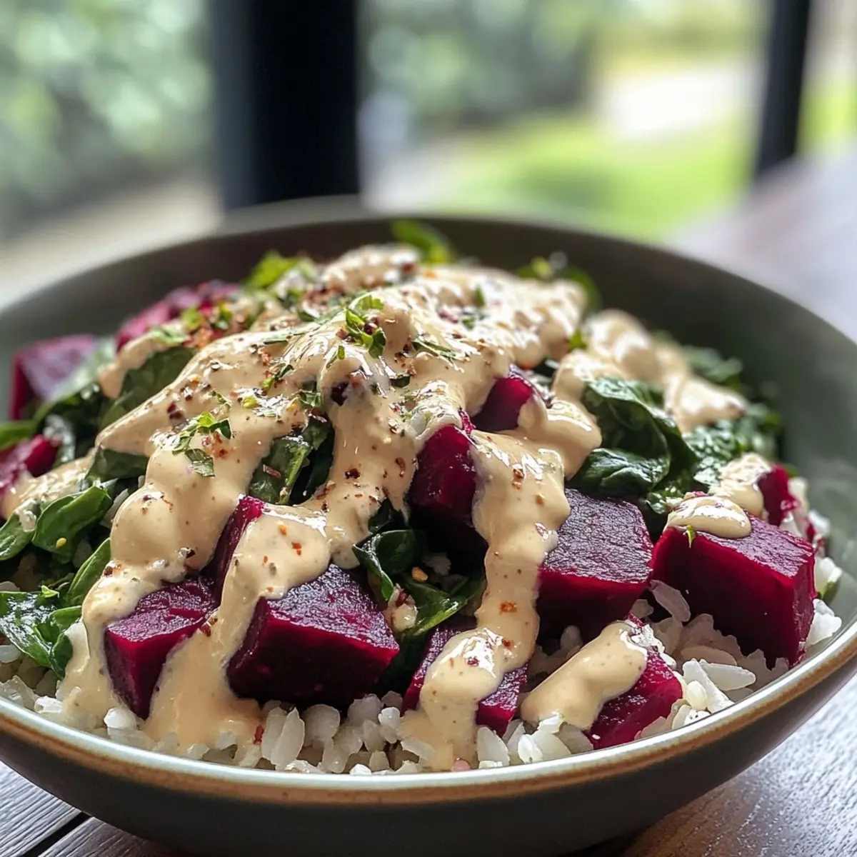 Irresistible Savory Beet & Spinach Rice Bowl with Creamy Tahini Dressing