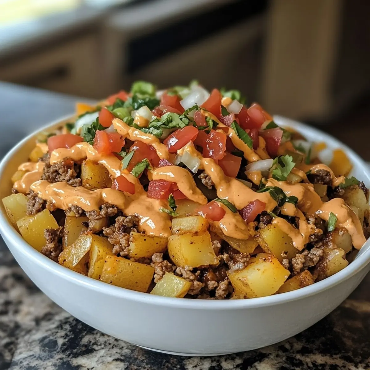 - Assemble your bowls by layering the crispy potatoes at the bottom and topping with the meat mixture evenly. Don’t be shy—load it up!