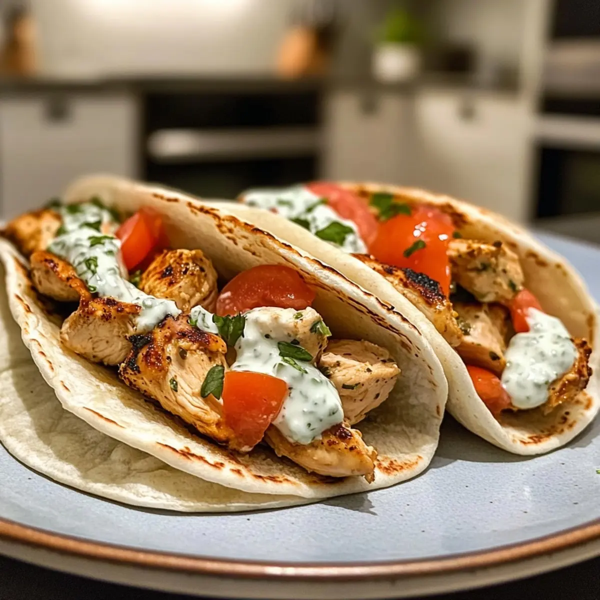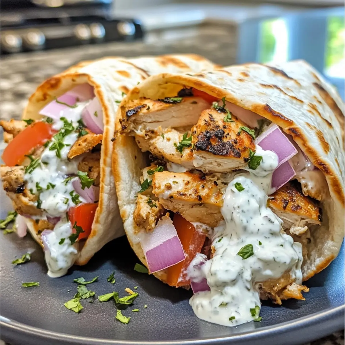 - On each warm pita, layer the sliced chicken, creamy tzatziki, and a variety of fresh veggies like sliced red onion, tomatoes, cucumber, and lettuce. Roll tightly and serve immediately.