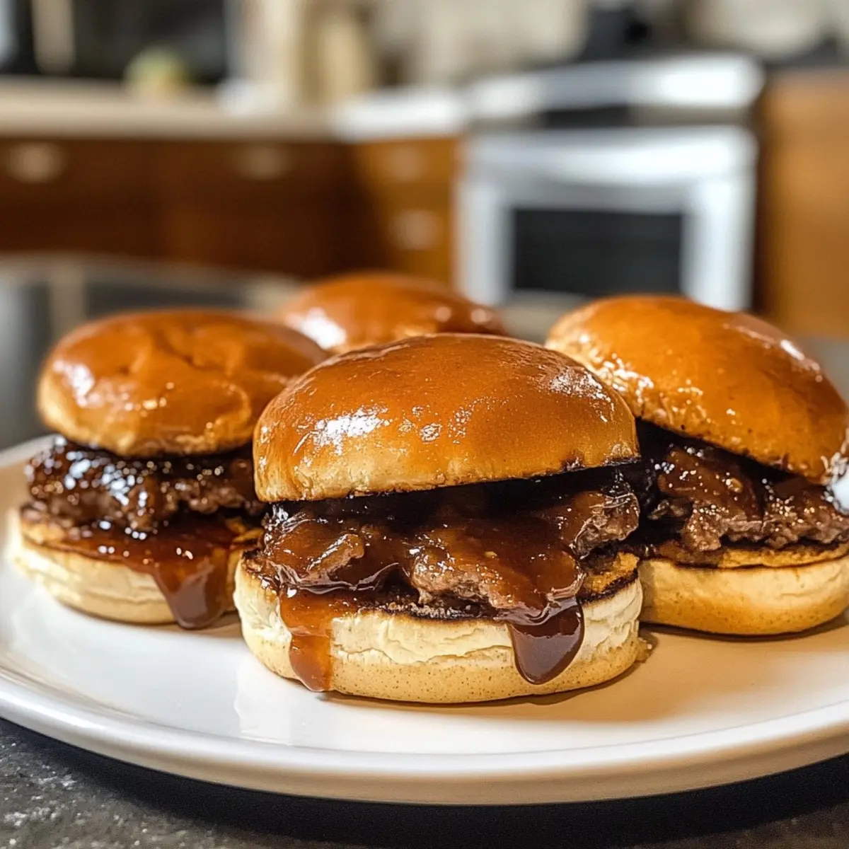 5. Assemble Sliders: Spread a layer of smoky BBQ sauce on the bottom buns. Top with the cheesy beef patties, a generous helping of caramelized onions, crispy pickles, and finish with the top buns.