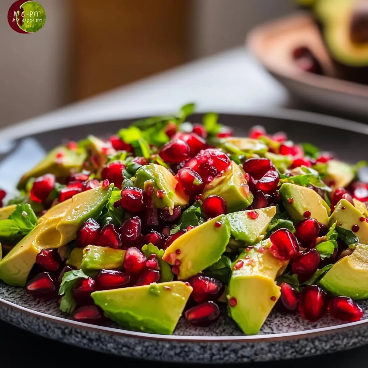Freshness, The combination of creamy avocado and juicy pomegranate seeds creates an irresistibly refreshing experience.