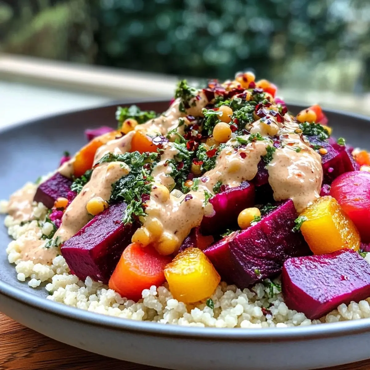 • Prepare to dive into the vibrant flavors of this Vibrant Beet & Creamy Couscous Vegetable Bowl Recipe Delight!