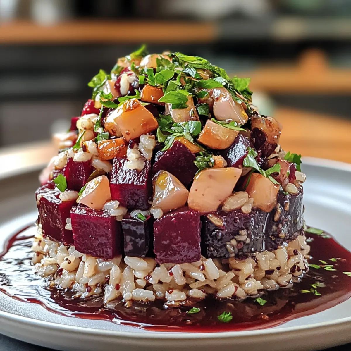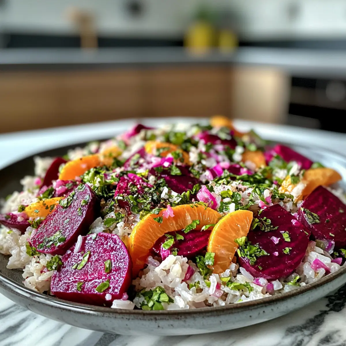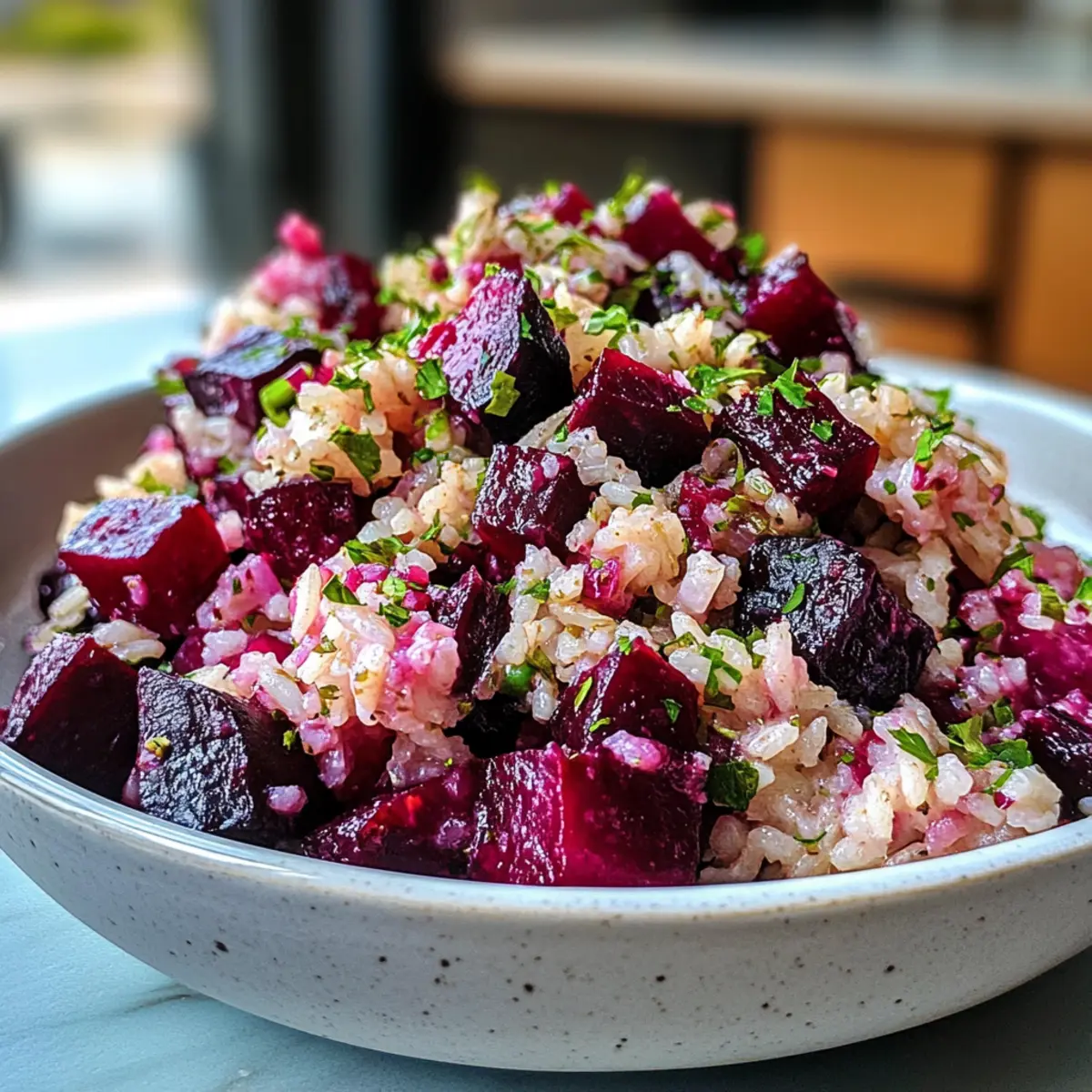 Colorful Presentation: The vivid hues of roasted beets combined with fluffy rice and fresh herbs create a stunning visual feast.