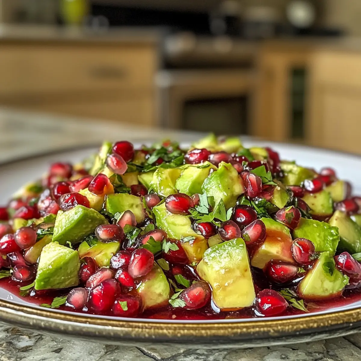 Add pomegranate seeds: Gently fold in the fresh pomegranate seeds. Be careful to distribute them evenly without mashing the avocado.