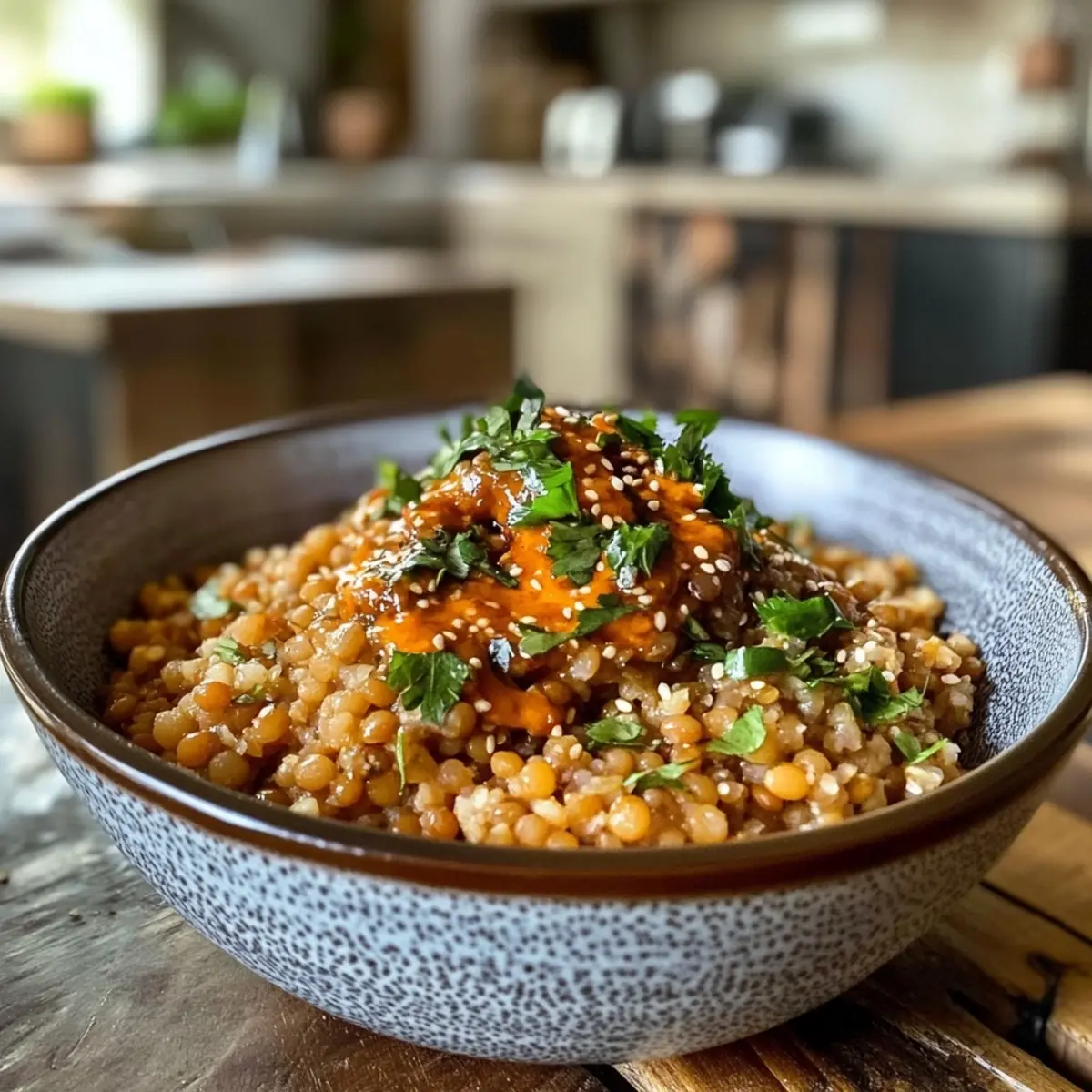 Comforting Warm Lentil Bulgur Bowl with Sweet Caramelized Onions